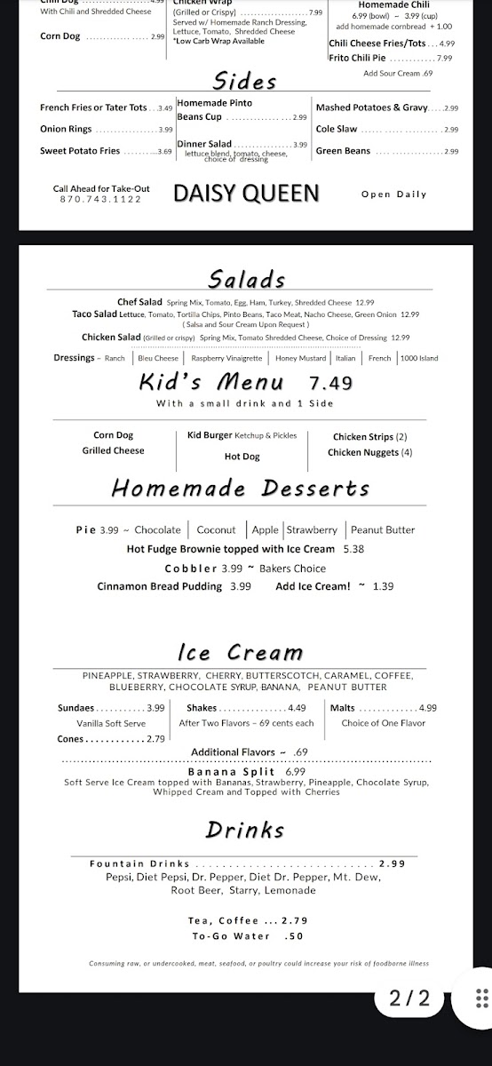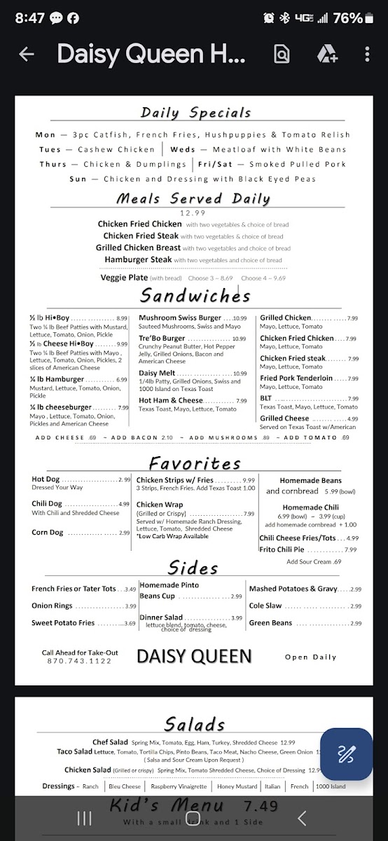 At Daisy Queen, located on 8999 AR 7 in Harrison, AR, the menu is a delightful mix of classic American comfort food, perfect for any craving. Whether you're in the mood for a quick bite or a leisurely meal, the options here never disappoint. From crispy fried chicken to mouthwatering burgers, there's something for everyone. Their milkshakes, thick and creamy, are a fan favorite, providing the perfect sweet finish to any meal. The atmosphere is relaxed, and the food speaks for itself-fresh, flavorful, and made to satisfy. The Daisy Queen Menu is a treat for those looking to enjoy a wholesome, down-to-earth dining experience in the heart of Harrison. Each dish is crafted with care, ensuring you get that homey, comforting feel with every bite. So, next time you're in town, stop by and let the menu take you on a tasty journey.